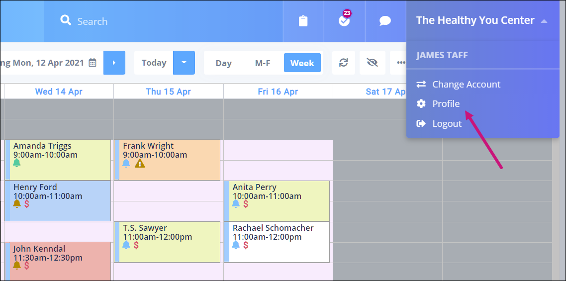 - On the top-right corner of your dashboard, click on your name. In the pop-up menu that appears, click on Profile.
