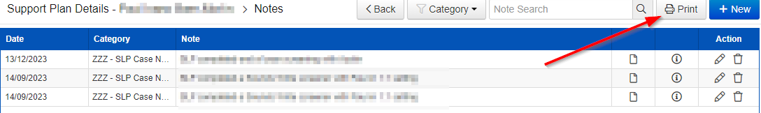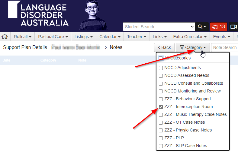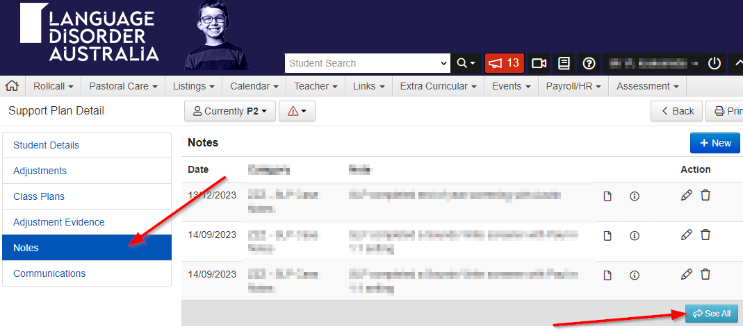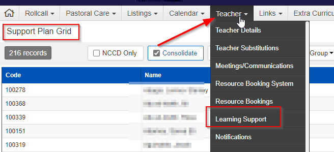1. Find the student for whom you want to generate a notes report in Support Plan Grid