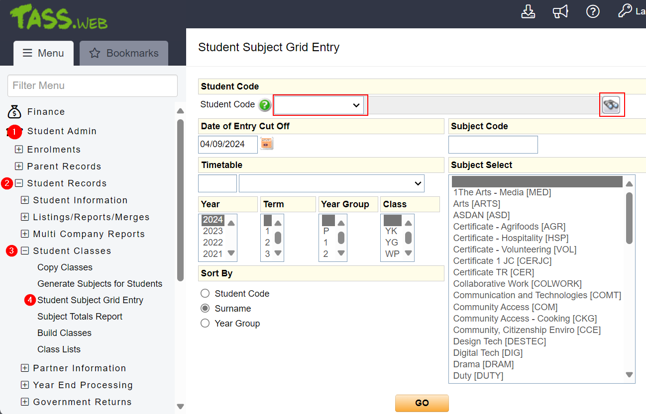 6. Hit "GO" and this will only the student's assigned classes and their subjects.