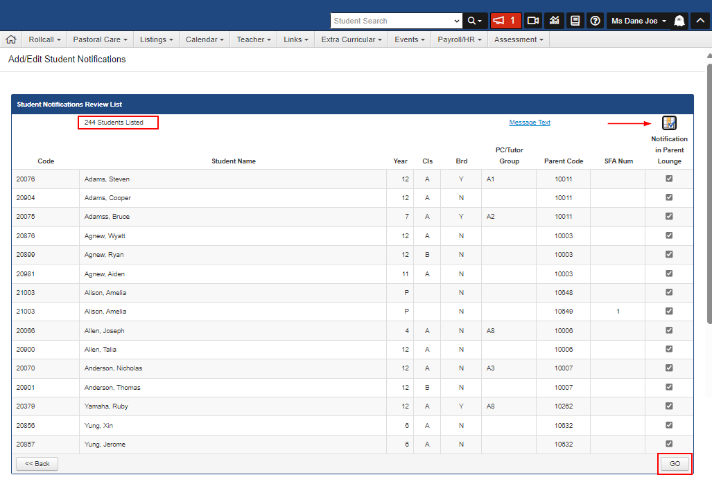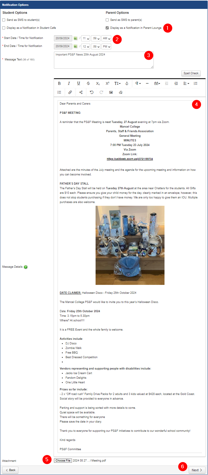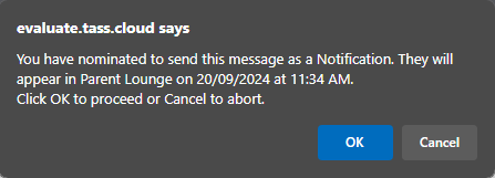 - Make sure you click Display as Notification Parent Lounge. THIS is what sends this message as a Notification to the families.