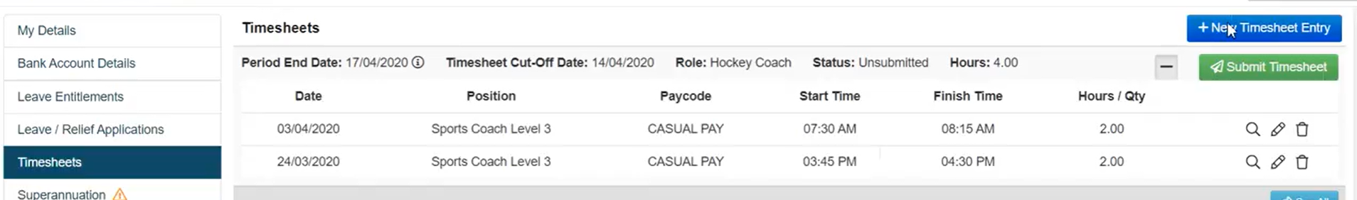 On the right-hand side menu, click on Timesheets, and select the blue button that says "+New Timesheet Entry".