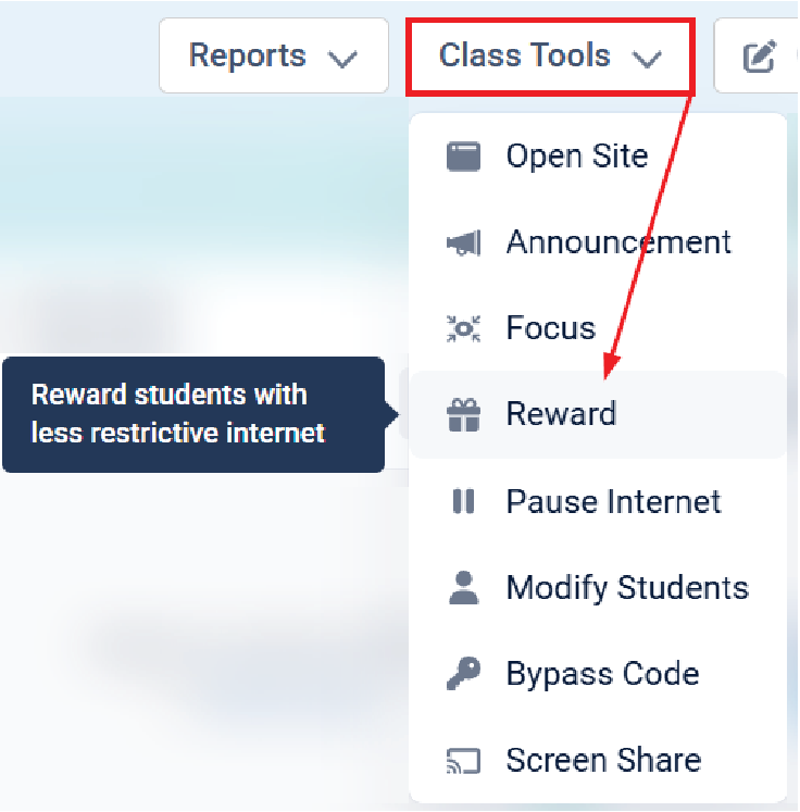 1. Click on Class Tools. Select Reward in the dropdown menu.