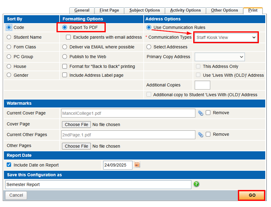 - Make sure in the Formatting Options and make sure "Export to PDF" is selected.