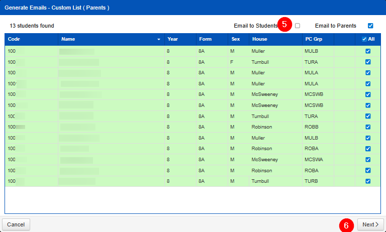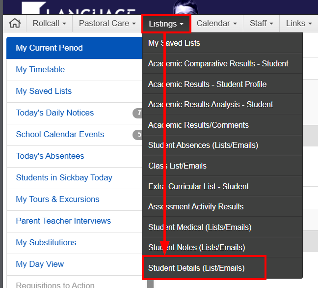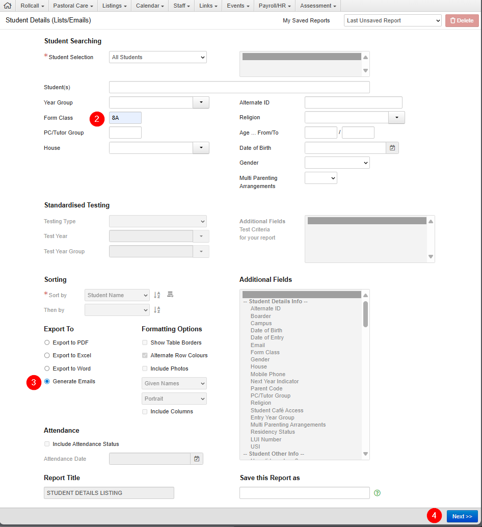 - Using the menu navigate: Staff Kiosk -> Listings -> Student Details (List / Emails)