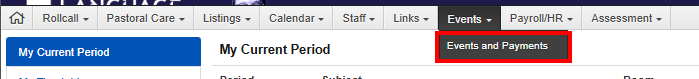 - Log into Teachers Kiosk. Hover over Events in the top Menu bar, and select Events and Payments.