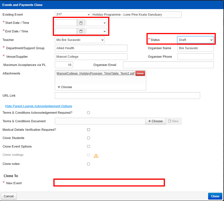 - Cloning an existing event will prefill the data for you. Allowing you to update the event with fresh details: