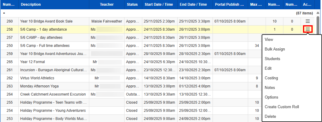 - Once you have created your event and it has been approved you can assign any group of students you wish and bulk email the group parents using the options under the 3 horizontal lines corresponding to your event under the Events Tab.