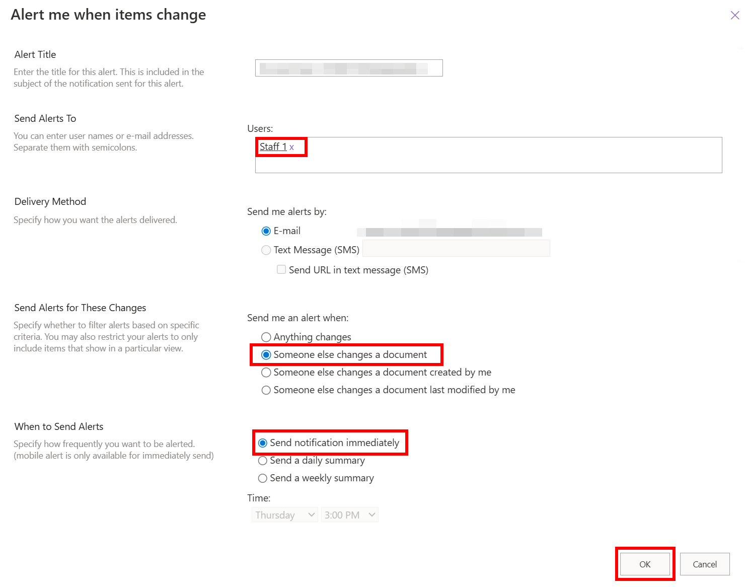 - Send Alerts for These Changes → All changes, or only when someone else changes it.