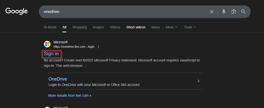 10. On your laptop, to access the photos, search 'OneDrive' and click 'Sign in'.